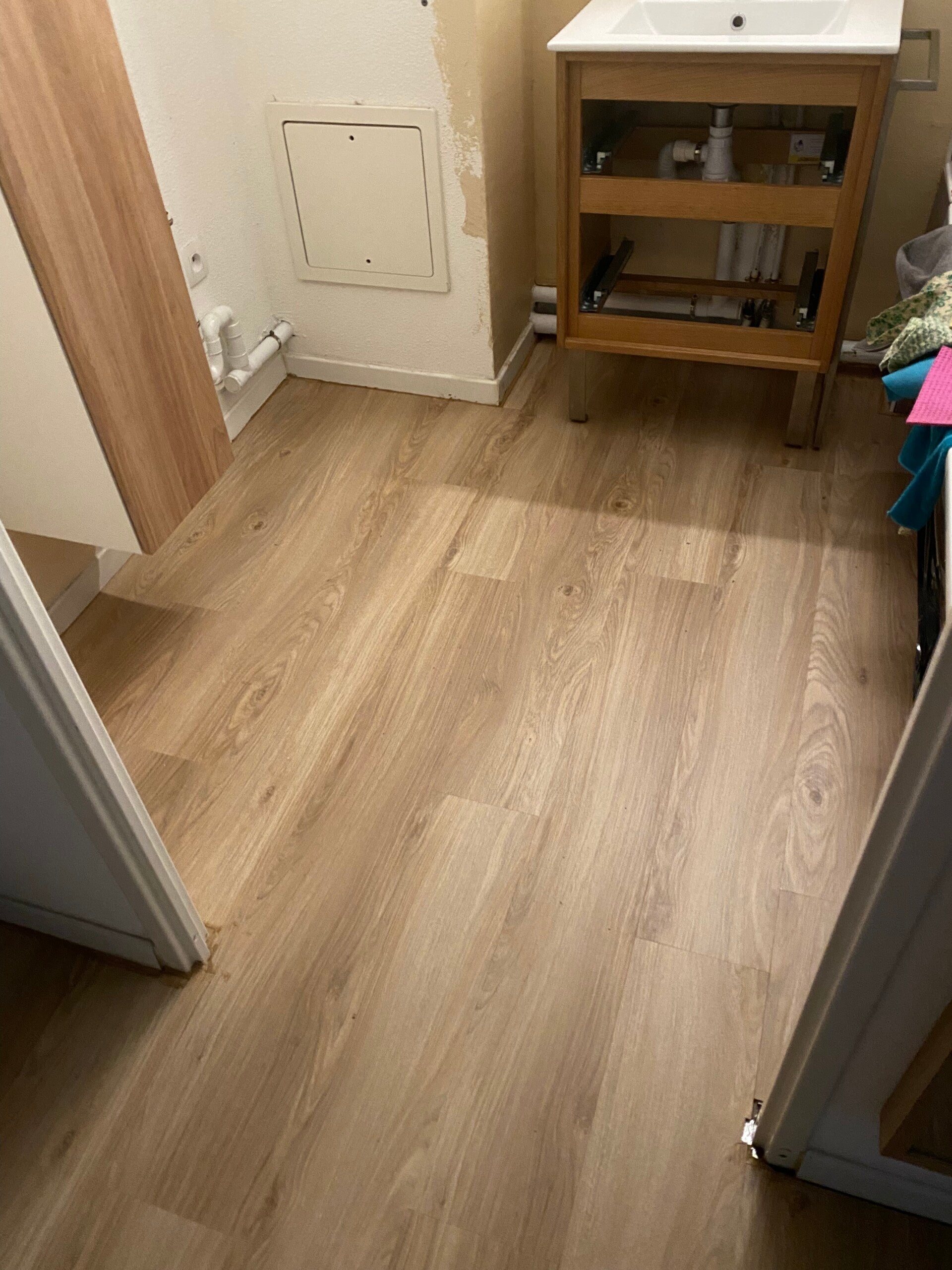 Un conseil que je donnerais : afin de créer plus de confort visuel et de repos pour une chambre, même d'amis : recouvrez le carrelage avec un revêtement simple d'entretient et sain. L'aspect du carrelage est généralement froid et dur, il n'est pas propice à la détente. Il existe certains carrelages avec des effets bois ou différents visuels bluffants, mais ici ce n'est pas le cas. ^^