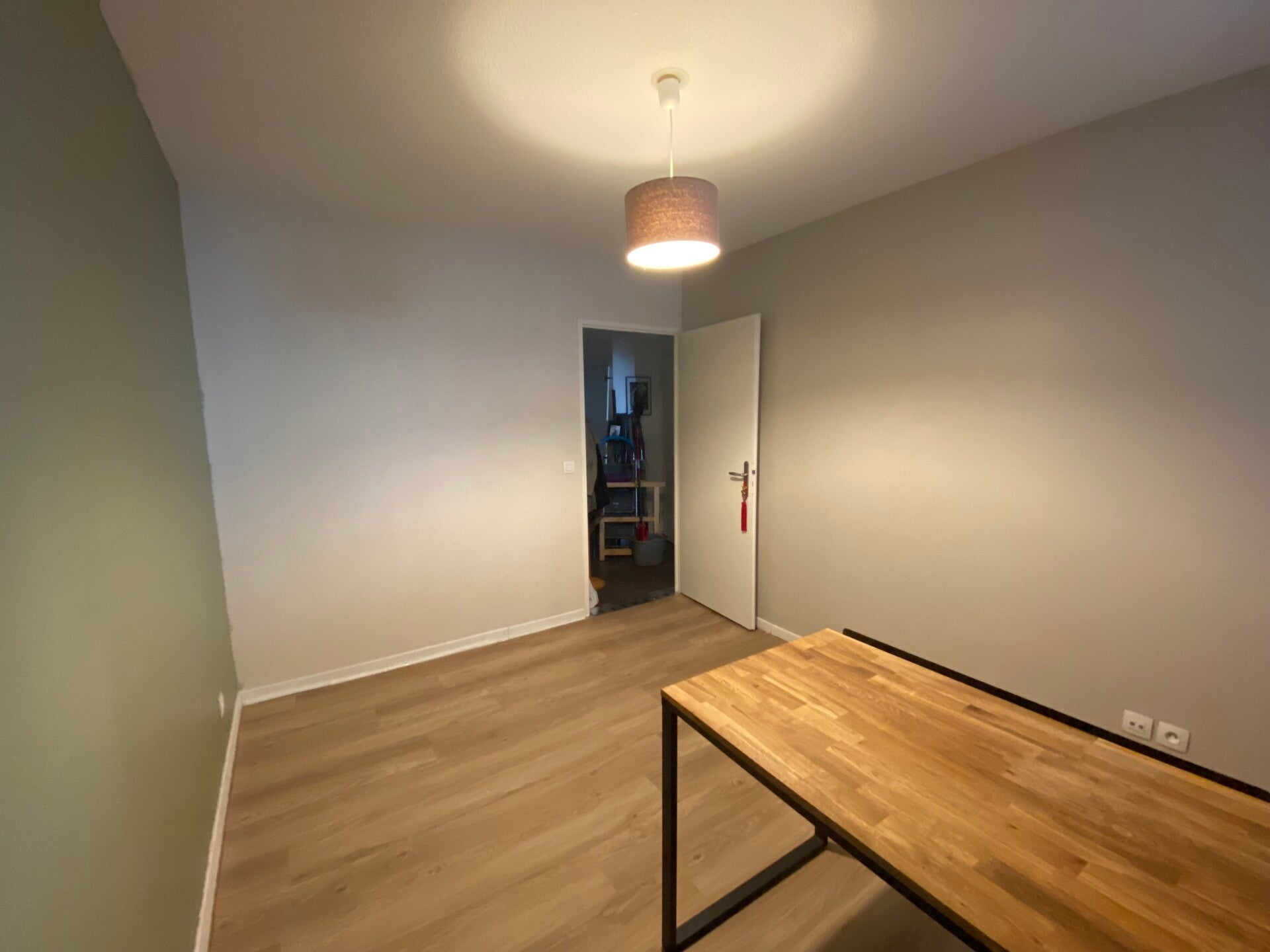 Au premier plan à droite un grand placard pour les balais, l'aspirateur, les paniers pour les produits de nettoyage et seau-serpillère.